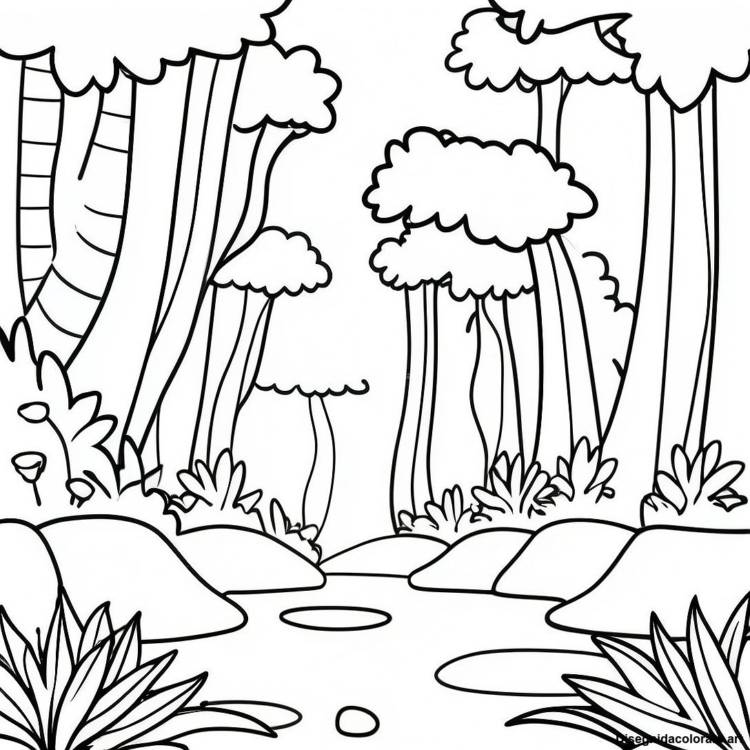 Scarica il PDF Stampabile di Disegno Da Colorare Di Scena Lussureggiante Della Foresta Pluviale