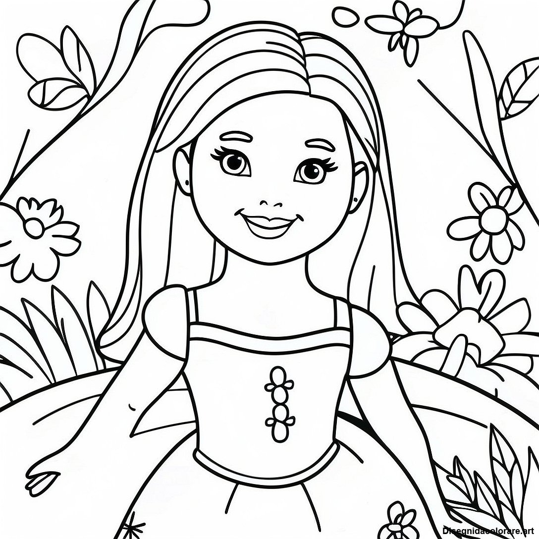Scarica il PDF Stampabile di Pagina Da Colorare Di Barbie Chelsea In Un Giardino Magico