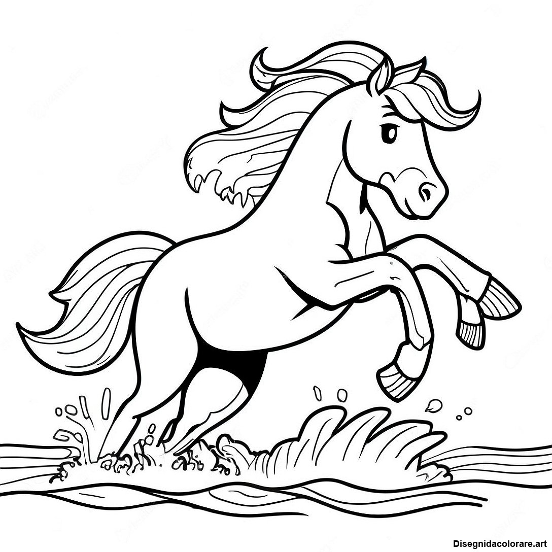 Scarica il PDF Stampabile di Pagina Da Colorare Di Un Cavallo Dinamico Che Salta Attraverso L'acqua