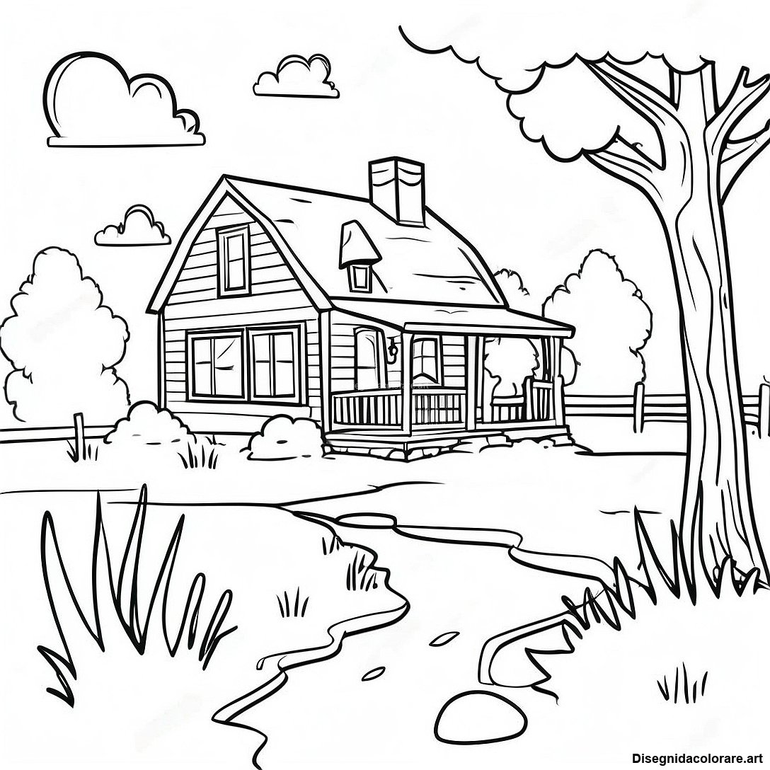 Scarica il PDF Stampabile di Pagina Da Colorare Di Un Paesaggio Rustico Di Casa Di Campagna