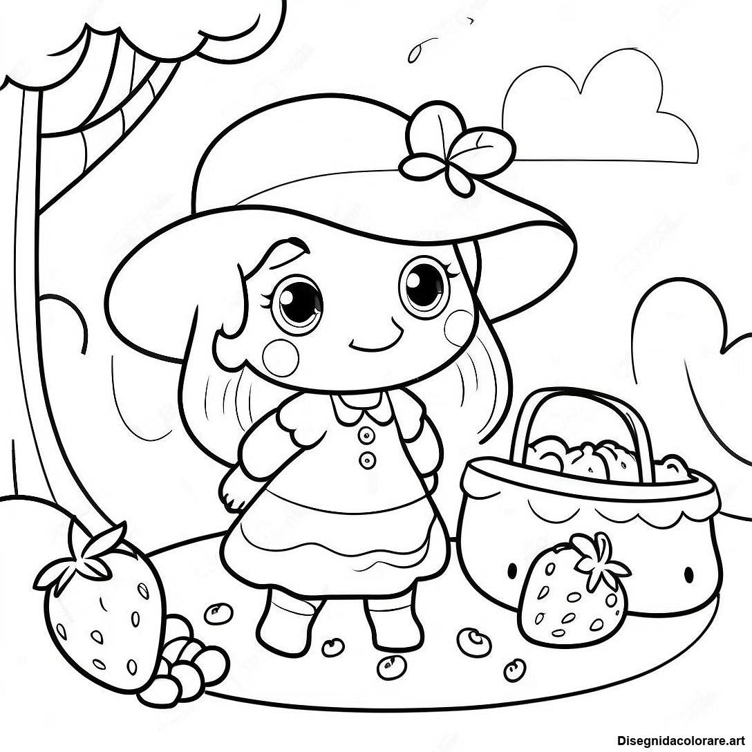 Scarica il PDF Stampabile di Pagina Da Colorare Di Una Adorabile Torta Di Fragole In Una Scena Di Picnic